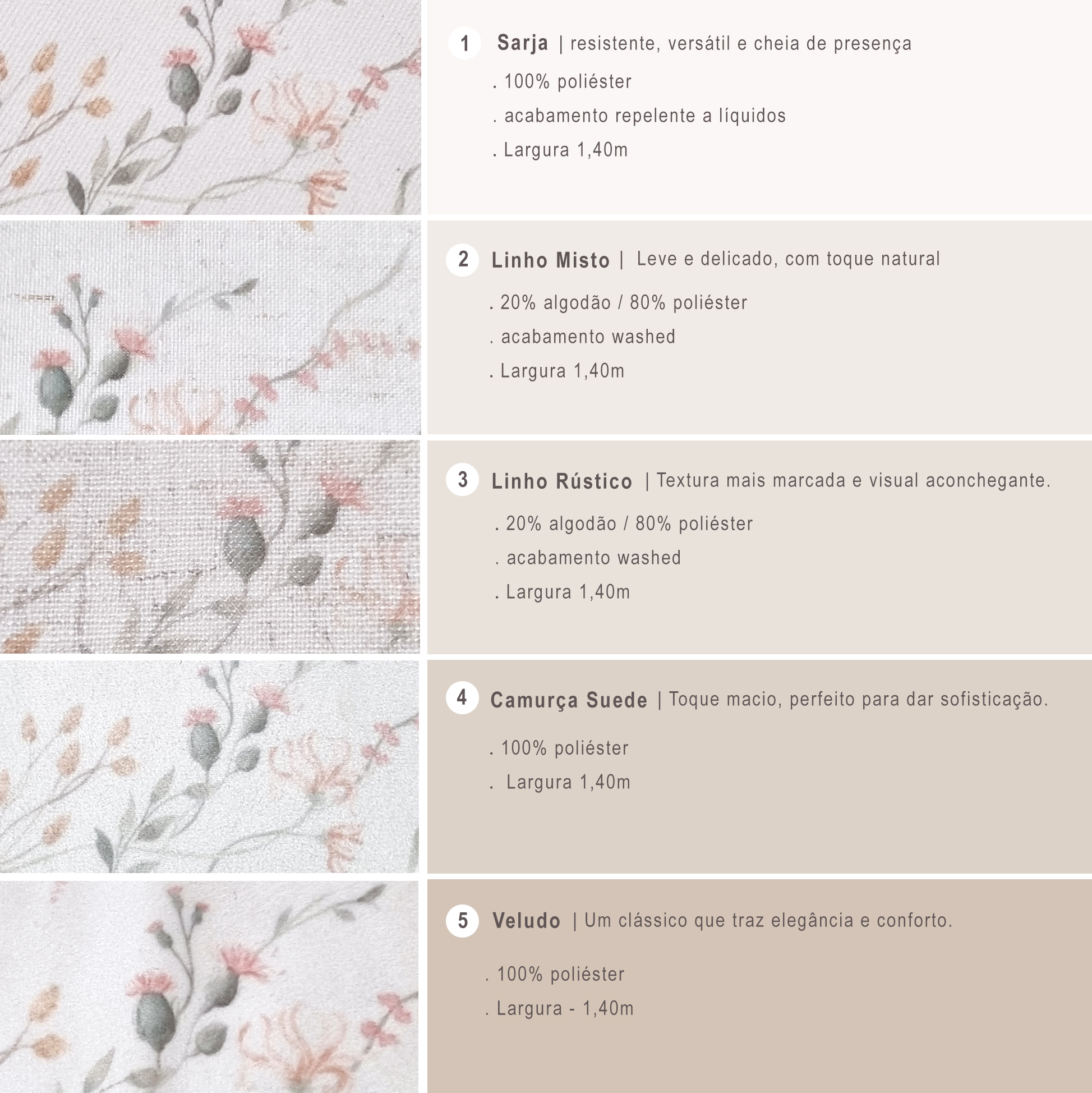 Assim, é possível criar almofadas, cortinas, enxovais, estofados e muito mais, compondo o ambiente de forma única e totalmente pensada para você.
